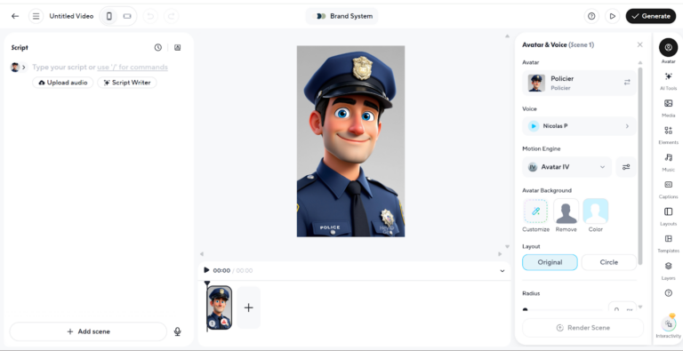 - Choisissez le personnage, puis laissez l’IA créer automatiquement les scènes, animations, transitions, musique et voix off
