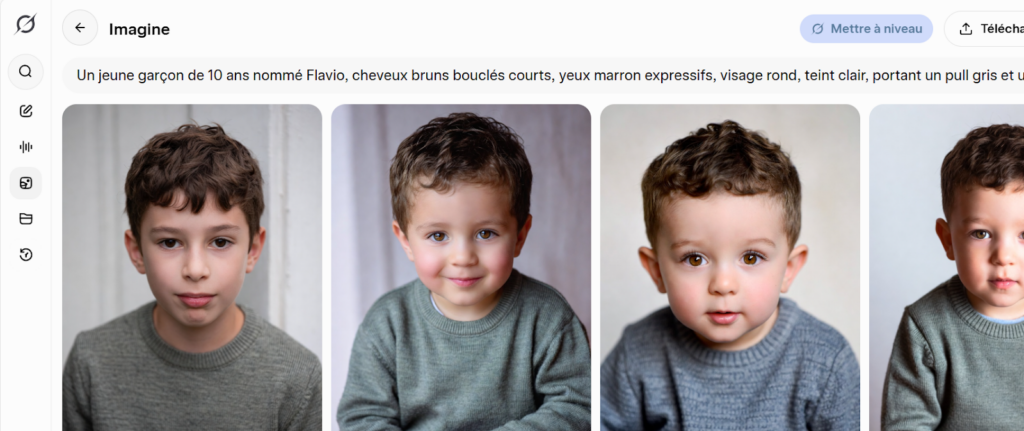 « Rédige une description précise et complète d’un jeune garçon de 10 ans nommé Flavio (cheveux bruns bouclés courts, yeux marron expressifs, visage rond, teint clair, pull gris, pantalon bleu), utilisable dans tous mes prompts vidéo. »
