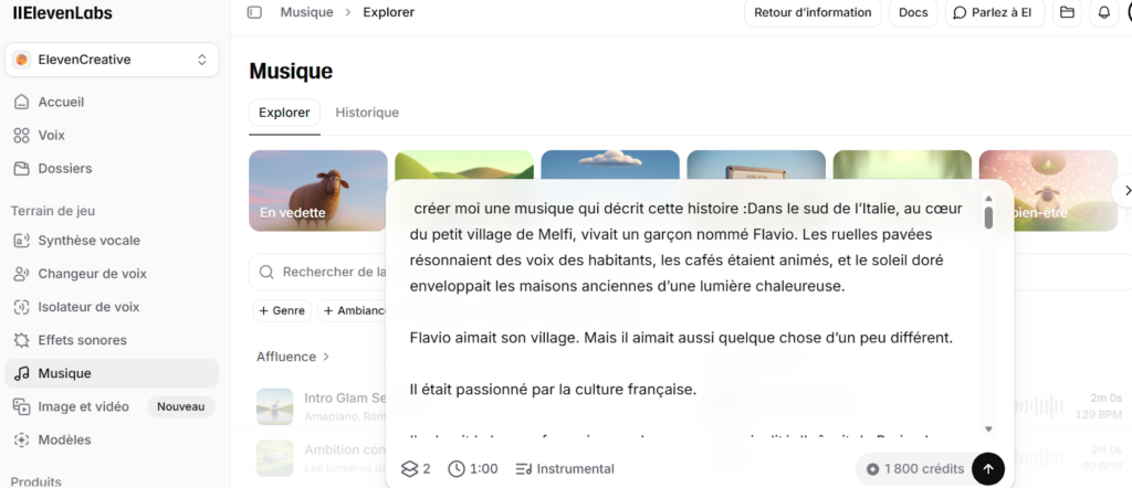 Une fois connecté, vous découvrirez plusieurs options sur le site. J’ai personnellement choisi l’option Musique, afin de créer rapidement une piste adaptée à mon projet.