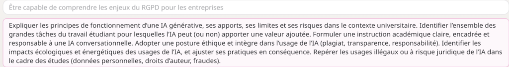 Cependant, pour la « Compétence visée », ce que me propose l’IA n’a rien à voir avec ce que j’ai demandé… l’exemple fourni parle de pouvoir « expliquer les principes de fonctionnement d’une IA générative »… un bug ?