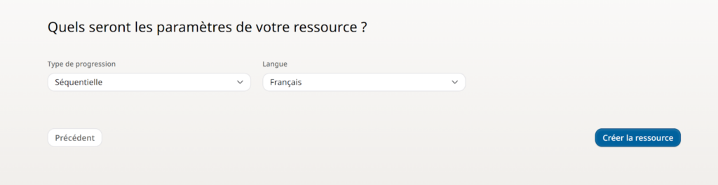 On peut choisir le type de progression comme “Séquentielle” ou “Libre”. Pas d’explication n’est fournie. Je suppose que “Libre” veut dire qu’on peut sauter d’un chapitre à un autre sans suivre d’ordre précis. Je choisis donc “Séquentiel”.