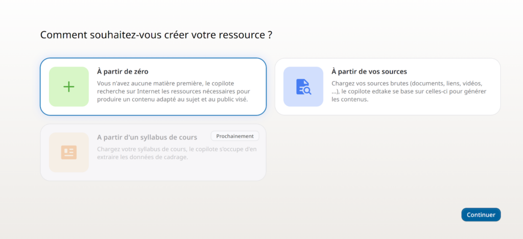 D’emblée, la plateforme me demande comment je souhaite créer ma « ressource » : à partir de zéro, ou bien de sources existantes. Ici, je clique « A partir de zéro ».