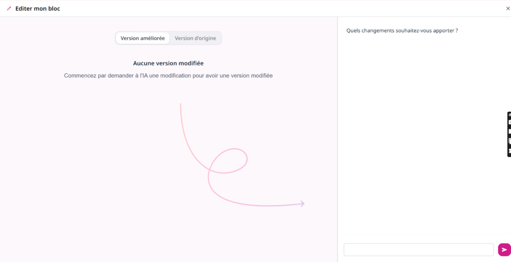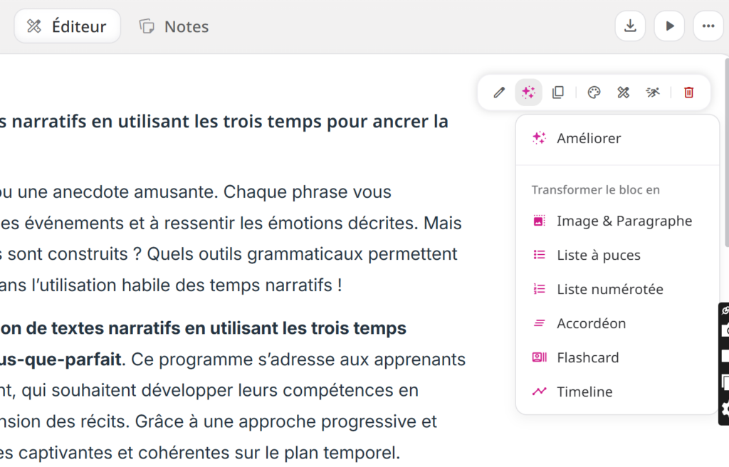 A droite de chaque bloc, un menu supplémentaire me propose d’améliorer le texte avec l’IA.