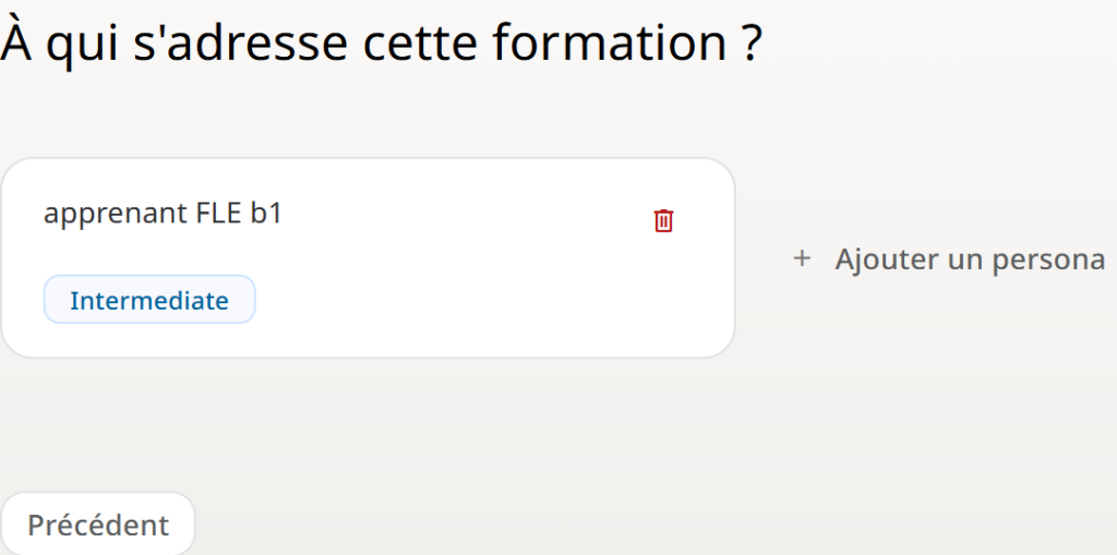 Sur l’étape suivante, je dois renseigner le profil type de mes apprenants.