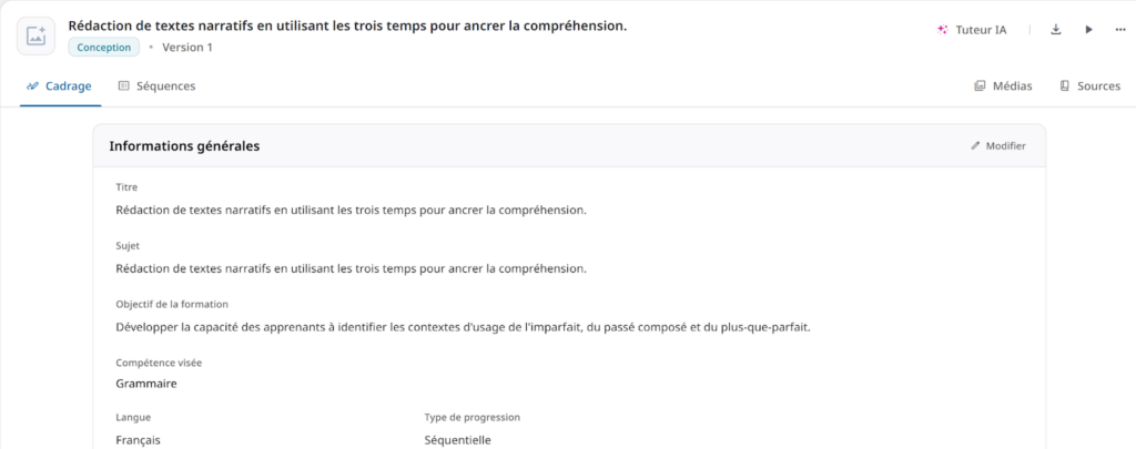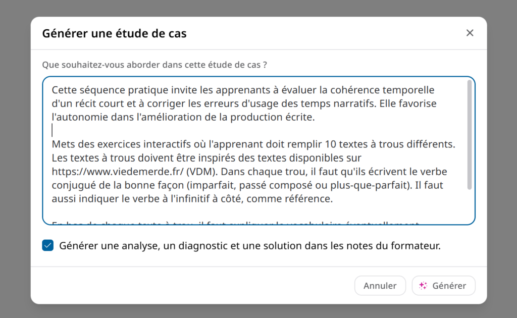 Pour la séquence de type « Etude de cas », lorsque je demande de générer le contenu avec l’IA, l’interface me propose de remplir un texte précisant ma demande, ce que « Introduction et « Apprentissage théorique » ne faisaient pas.