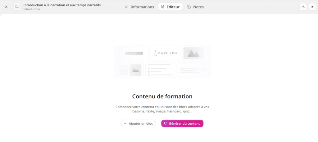 L’évaluation ne peut pas être créée avec l’IA. Il faut nécessairemment que le formateur crée lui-même son évaluation. Le fameux bouton rose « Générer du contenu » n’apparaît pas ici.