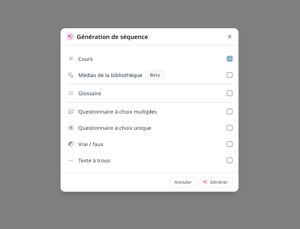 Pour la séquence de type « Apprentissage théorique », lorsque je demande de générer le contenu avec l’IA, les options suivantes me sont proposées. C’est déjà une avancée par rapport à la séquence « Introduction » où aucune pré-personnalisation n’était possible.