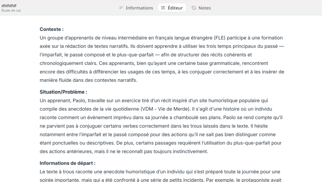Le résultat n’est malheureusement pas à la hauteur de ma demande. Non seulement aucun exercice n’a été généré, mais en plus L’IA réutilise mes instructions pour créer une étude de cas fictive… non adaptée à un cours de FLE.