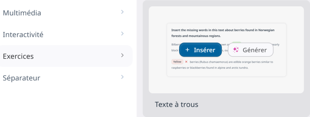 - à générer des exercices interactifs (pour des questions très théoriques, davantage adaptées à des questions par exemple sur les connaissances cultures/civilisationnelles dans un cours de FLE).