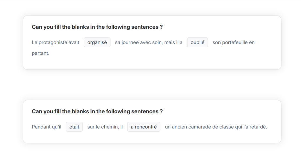 Des exercices de texte à trous sont effectivement générés. Toutefois, les exercices sont basés sur la description générée précédemment par l’IA… et non pas mes instructions initiales de se référer aux histoires de la plateforme de VDM.
