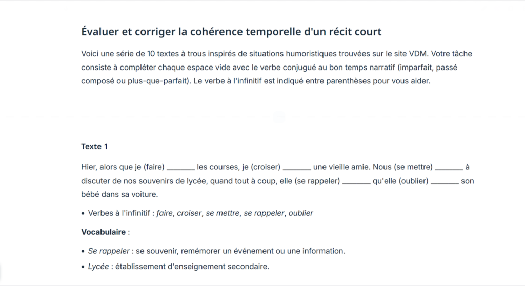 Cette séquence pratique invite les apprenants à évaluer la cohérence temporelle d’un récit court et à corriger les erreurs d’usage des temps narratifs. Elle favorise l’autonomie dans l’amélioration de la production écrite.