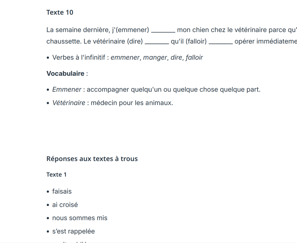 Cette fois, les exercices sont créés… mais pas de façon interactive. Il s’agit simplement d’un véritable texte à trous, que personne ne peut remplir directement sur l’ordinateur, et qui ne donne pas de correction immédiate non plus.