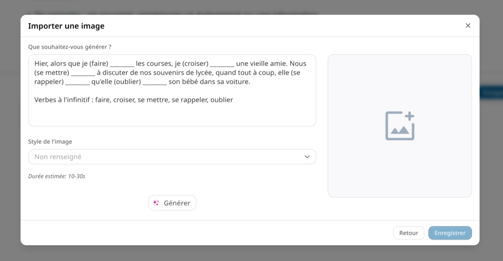 Je choisis l’option « Générer via l’IA ». Je copie-colle un des textes à trous générés précédemment, sans aucun autre changement, dans un esprit de minimiser le travail à fournir. Je peux aussi choisir le style de l’image, et je choisis « Bande dessinée ».