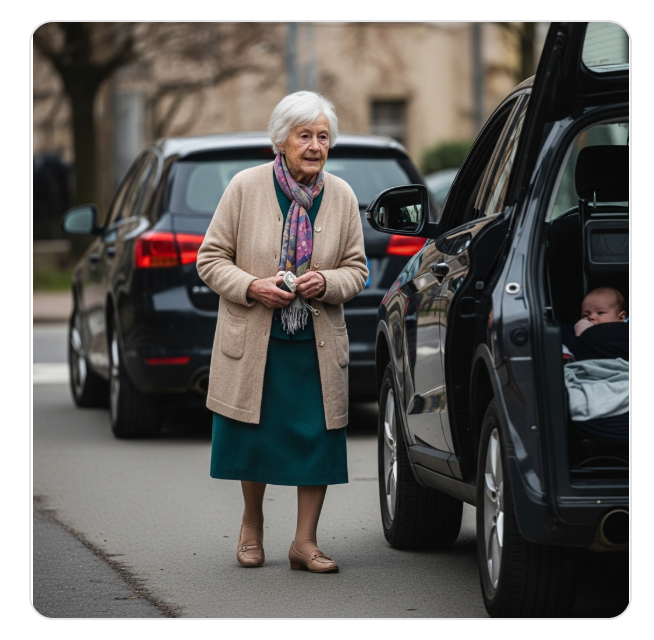 Cette fois, il n’y a plus de texte, et la consigne est presque respectée (il y a un bébé dans une voiture), mais surinterprétée (« vieille amie » est devenu « vieille dame »). Ce n’est pas non plus dans le style de l’aquarelle, et l’ambiance est plutôt sordide au lieu de transmettre l’idée de comédie.