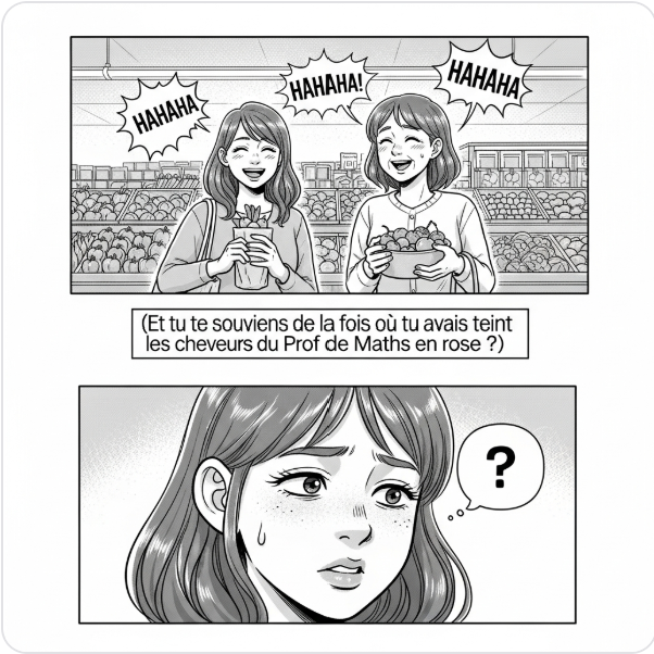 Le résultat traduit cette fois mieux l’ambiance du texte, tragi-comédie. Le style du manga est respecté. Toutefois, il y a une faute de français, « cheveurs » au lieu de « cheveux ». La plateforme ne permet pas d’éditer directement l’image, et il faut donc regénérer une image. Cette fois, je rajoute en plus l’instruction « n’écris pas de texte ».